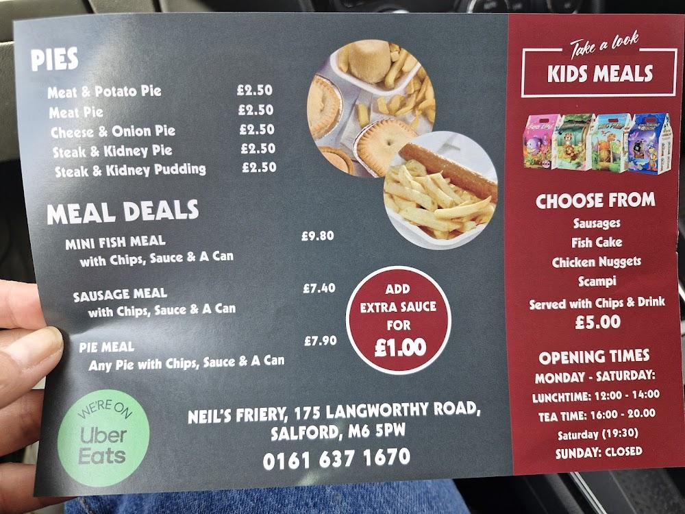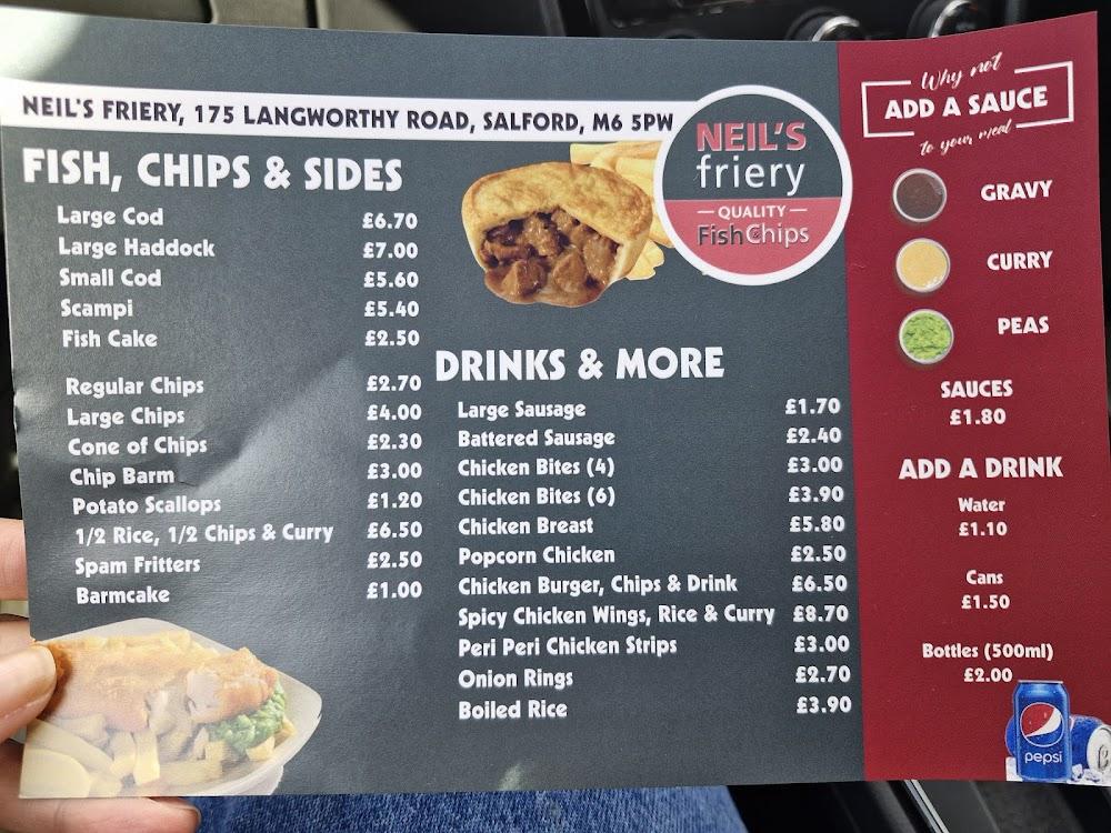 Located at 175 Langworthy Rd, Salford M6 5PW, Neil's Friery is a beacon for fish and chips lovers. The takeaway shop thrives on a passion for fresh, high-quality ingredients and a commitment to customer service. A short walk from the bustling Salford area, it offers an easy stop for lunch or dinner without breaking the bank. The casual feel welcomes families, groups of friends, and anyone craving freshly cooked food. The restaurant is fully accessible, ensuring comfort for all guests. Plus, with a menu that caters to kids and a relaxed atmosphere, it's perfect for a family outing or a quick dinner after a busy day. Their cash-only policy is a charming nod to simplicity in an ever-evolving world. Visitors can take advantage of their kerbside pickup, making it even easier to enjoy a meal on the go.